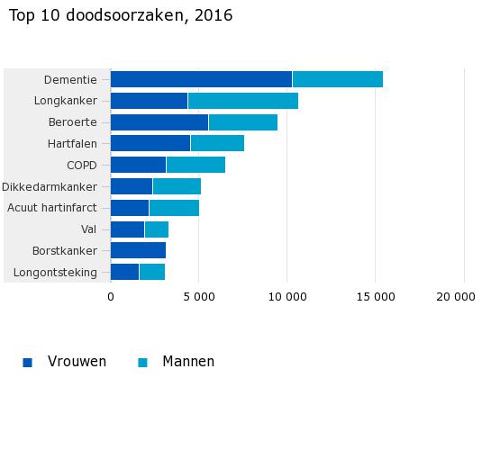 Met bijna 15,4 duizend sterfgevallen, 7 procent meer dan in 2015, staat dementie opnieuw bovenaan de lijst. Bij vrouwen is dementie met meer dan 10 duizend sterfgevallen (+ 5 procent) de belangrijkste doodsoorzaak. De sterfte aan dementie nam vooral onder mannen toe; deze was vorig jaar 11 procent hoger dan een jaar eerder. Bij mannen is dementie met ruim 5 duizend sterfgevallen na longkanker de meest voorkomende doodsoorzaak.